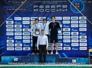 3 место — на дистанции 100 м в/стиль (юноши 15-16 лет) с результатом 49.27;