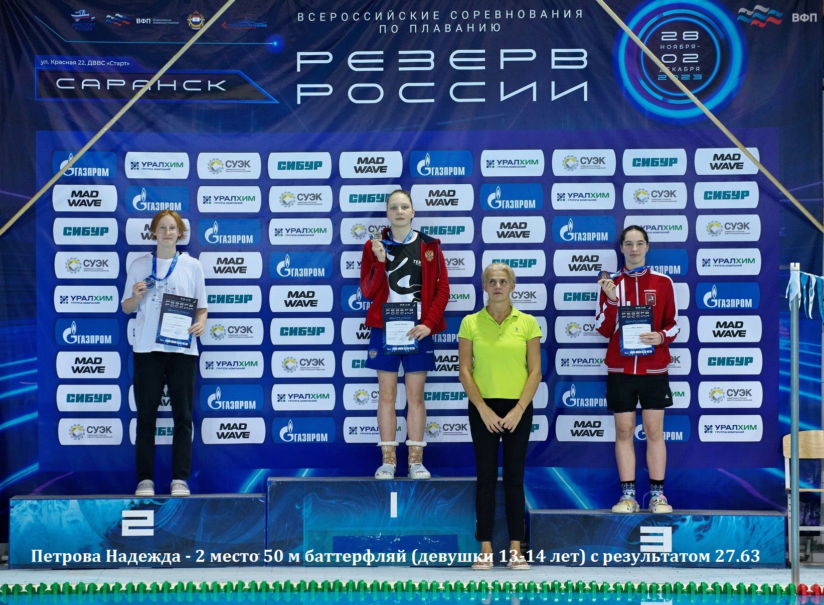 2 место — на дистанции 50 м баттерфляй (девушки 13-14 лет) с результатом 27.63.